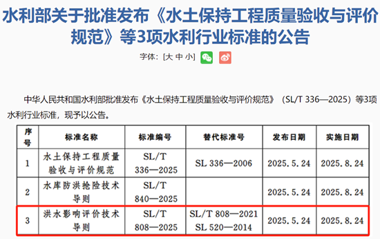 近日,公司參編水利行業(yè)標準《洪水影響評價技術(shù)導則》(SL/T 808—2025)(中華人民共和國水利部公告2025第12號)正式發(fā)布,將于2025年8月24日起實施。